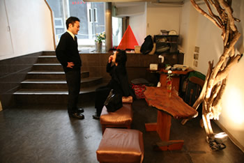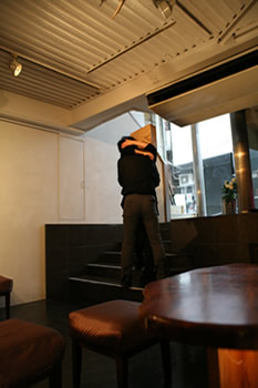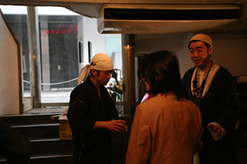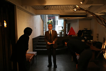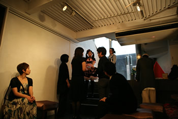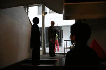 ギャラリーのオーナー峰山洋平が亡くなり、 会場の地下ではギャラリー葬がとり行われています。実際に地下には洋平の遺品が展示されており、献花台が置かれていました。お客様には受付の後、地下に下りて献花をしていただきました。