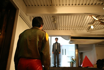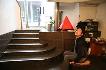洋平の隠し子、田村冬美登場。洋平の最期を看取ったのは彼女でした。本葬にも来ていて、今日も来ると聞いていました。急にあわただしくなる面々。今日は彼女と遺言の話をしなければならないのです。ちなみに左の写真中央に写っている赤いピラミッド型のオブジェは、ギャラリー悠玄が所有する、とある建築家さんが製作した作品で、今回は特別に公開させていただきました。