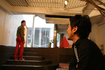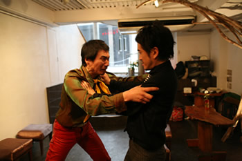 ギャラリーの2階では平和尚の展示が行われていました。友人の水野太郎以外はほとんど人が訪れません。奥さんや子供がいるのに作品作りをやめられず、生活に窮している平和「ミルク代にも事欠く毎日ですよ」、水野「奥さんと子供どうすんだよ!」。平和「お前には分かんないよ」。そしてそれの仲裁に入る峰山良樹(春男の叔父、洋平の弟)。良樹は中野で居酒屋「のむのむ」を経営しており、水野は以前そこでバイトをしていました。写真右、左が平和、中央が水野、右が良樹です。